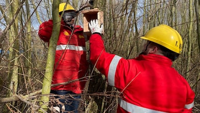 Medewerkers en aannemers van Shell Moerdijk hebben afgelopen weekend 100 vogelhuisjes opgehangen en plastic geruimd in het bos op het terrein van Shell Moerdijk.